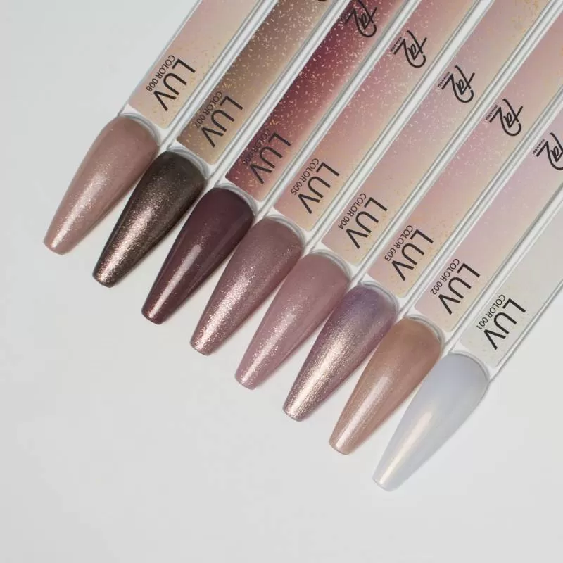 LUV — это коллекция из 8 изысканных гель-лаков от TA2, созданная для тех, кто ценит элегантность, мягкое сияние и утончённую гамму. Каждый оттенок преображает маникюр благодаря нежному перламутровому переливу в сочетании с крупным блеском, создавая эффект глубины и лёгкого свечения.