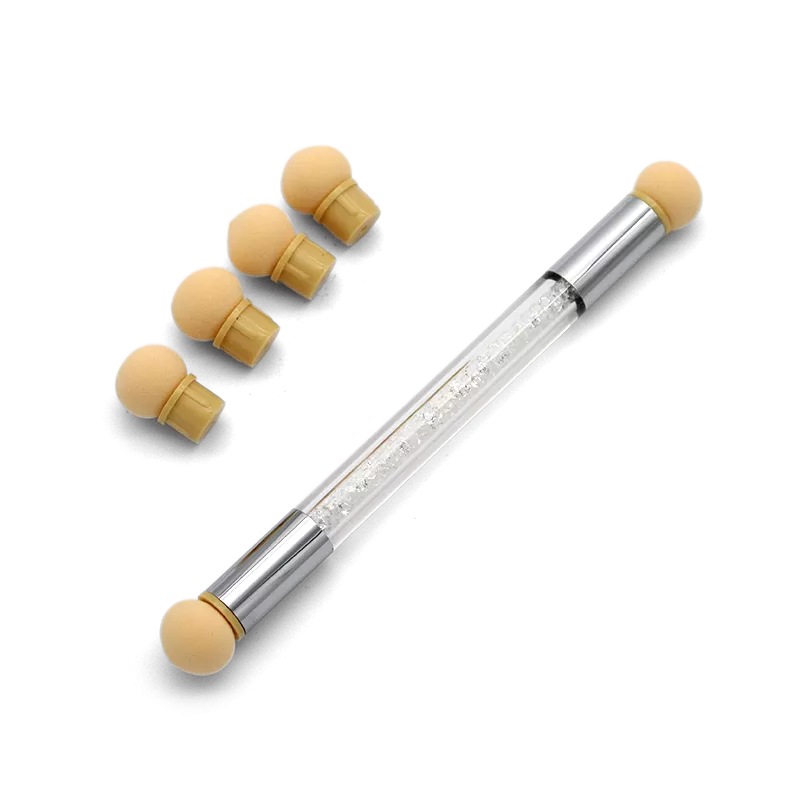 Инструмент представляет собой прозрачную стеклянную ручку с металлическими наконечниками, укомплектованную шестью сменными спонжами (пуфами), которые легко сменять при необходимости. Пуфы очень мягкие, имеют пористую структуру. Применяются для растушевки гель-паст, гель-лака и т.д.