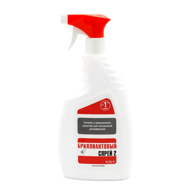 Дезинфицирующее средство “Бриллиантовый спрей 2” предназначено для экстренной дезинфекции небольших по площади, а также труднодоступных для обработки поверхностей в помещениях, предметов обстановки, приборов, медицинского оборудования, санитарно-технического оборудования, предметов ухода за больными, предметов, требующих быстрого обеззараживания и высыхания, в том числе спортинвентаря при инфекциях, обусловленных грамотрицательными и грамположительными бактериями (включая возбудителей туберкулеза), вирусами и грибами (включая возбудителей кандидоза и трихофитии);