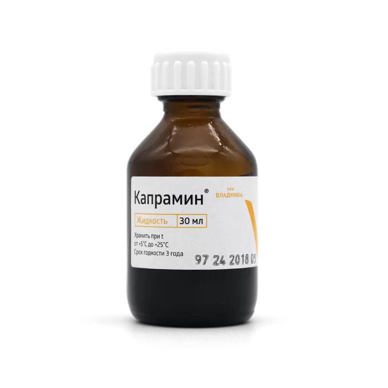 Капрамин представляет жидкость, в составе которой содержится центимониум бромид и хлористый алюминий, обладающие кровоостанавливающими свойствами, устранением очагов инфекции, обеззараживает раны с бактерицидным воздействием.